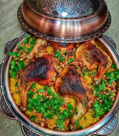 1️⃣صنيه بغطاء عربي نحاسي لتقديم الكبسة والمندى والحمام والموزة وكل المشويات
