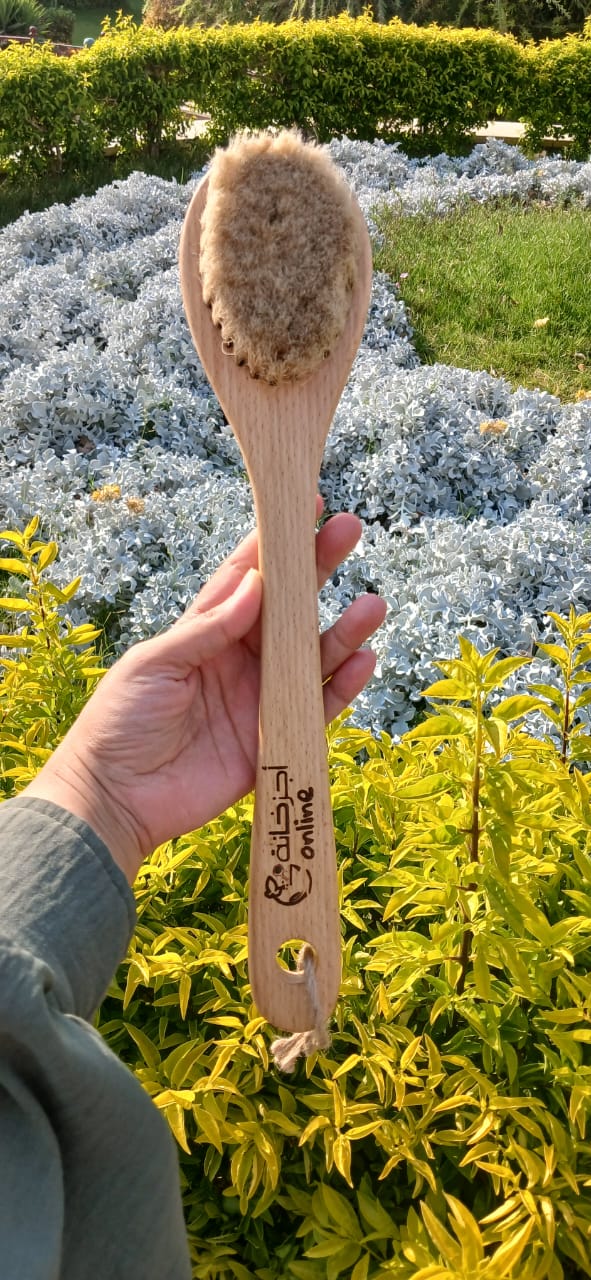 فرشاة جافة للجسم تتميز بيد طويلة من الخشب الممتاز ليسهل التحكم بها.