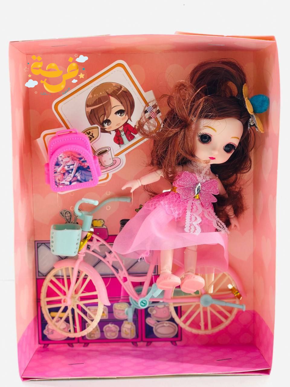 عروسة صغيرة ١٧ سم تقريبا مفصلات بالكامل معها عجلة وحقيبة ظهر