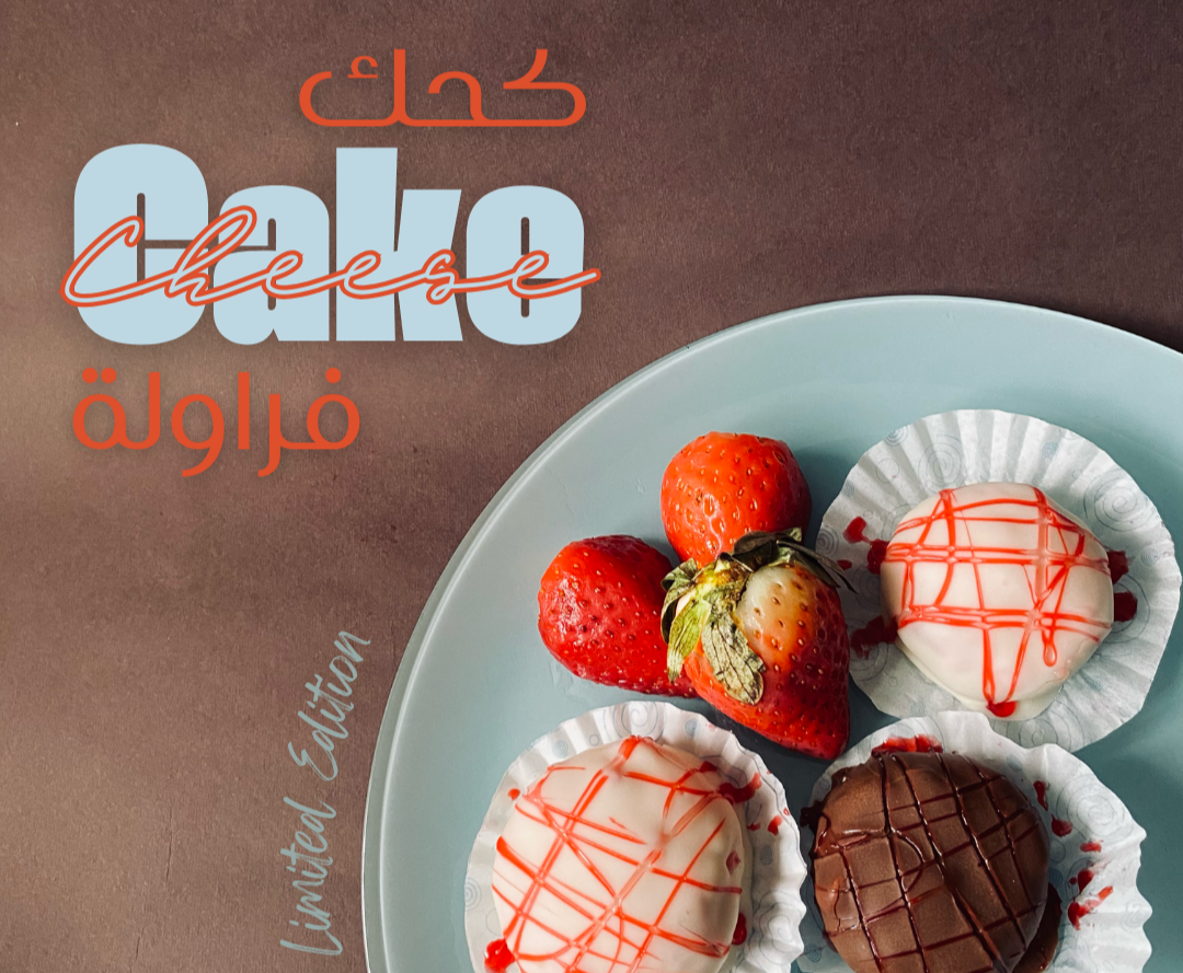 كحك جواه cream cheese معجونة بالفراولة الفريش المكرملة، ومتغطس في الشوكولاتة الغامقة أو البيضاء، وعليها صوص فراولة