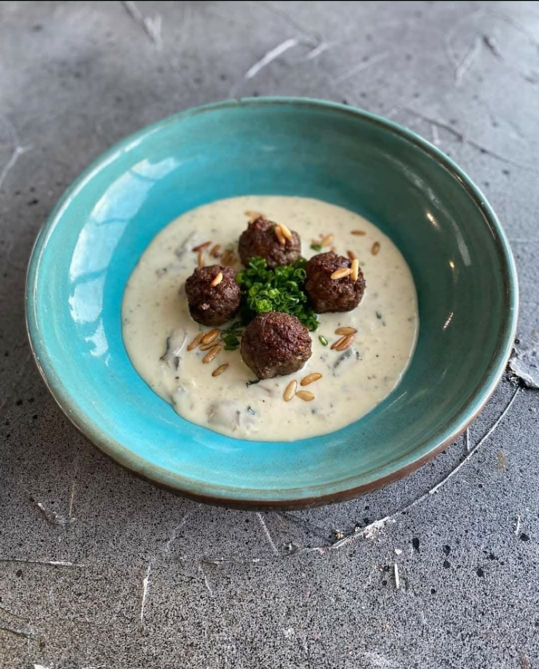 كرات من الكفتة الخالية من فول الصويا تدخل الفرن تستوي وتطلع توضع في صوص ابيض خفيف وقت التقديم فقط مش قبل كدة