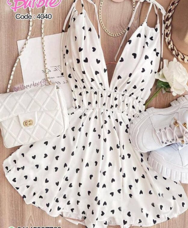 فستان ناعم من خامه الزبده ابيض بيه قلوب صغيره اسود